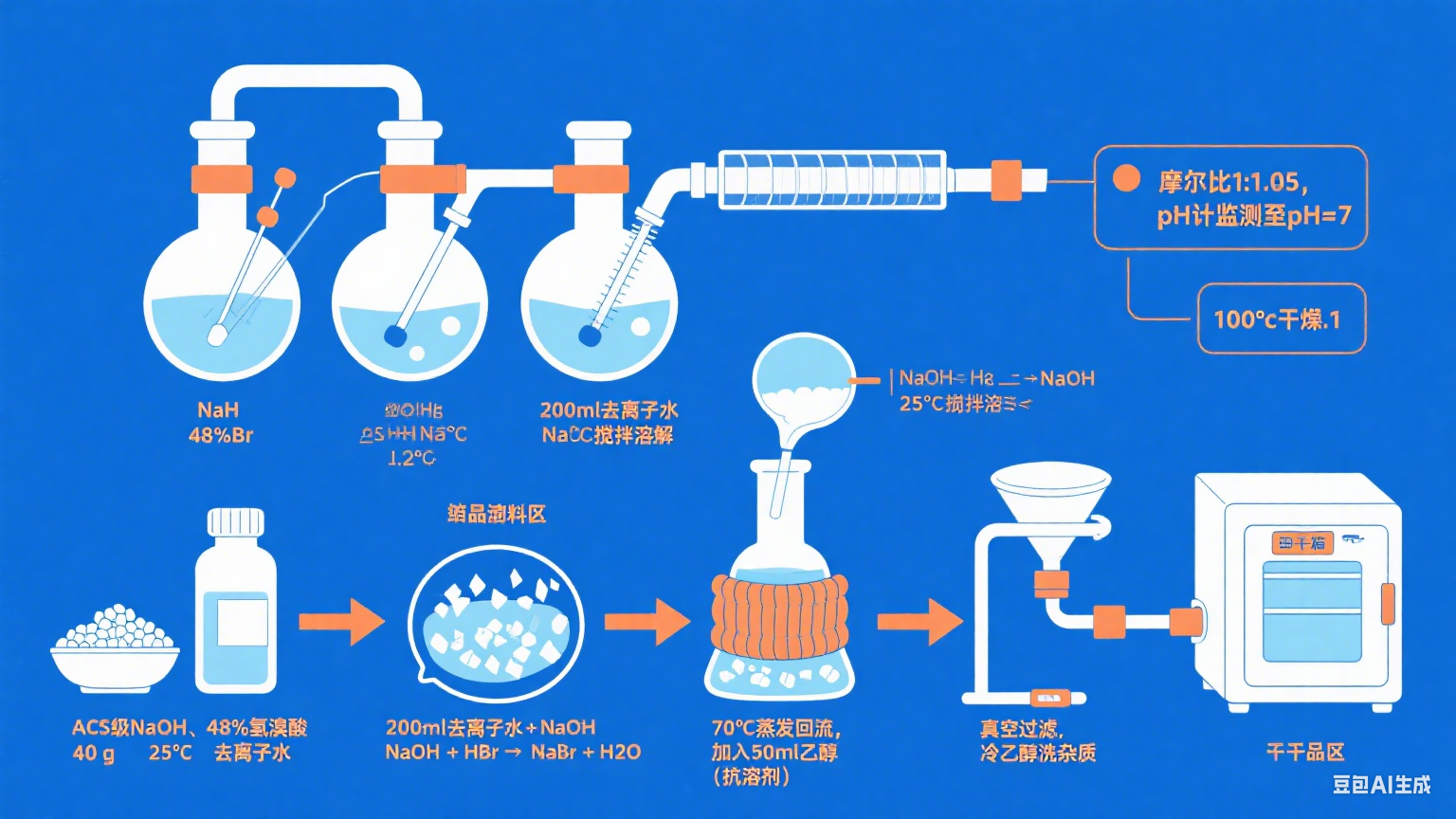 在持續攪拌的情況下,逐漸向氫氧化鈉溶液中加入氫溴酸(HBr)。NaOH與HBr的摩爾比保持在1:1.05,以確保完全中和。通過pH計監測溶液,確認中和反應的完成,終點約為pH 7。